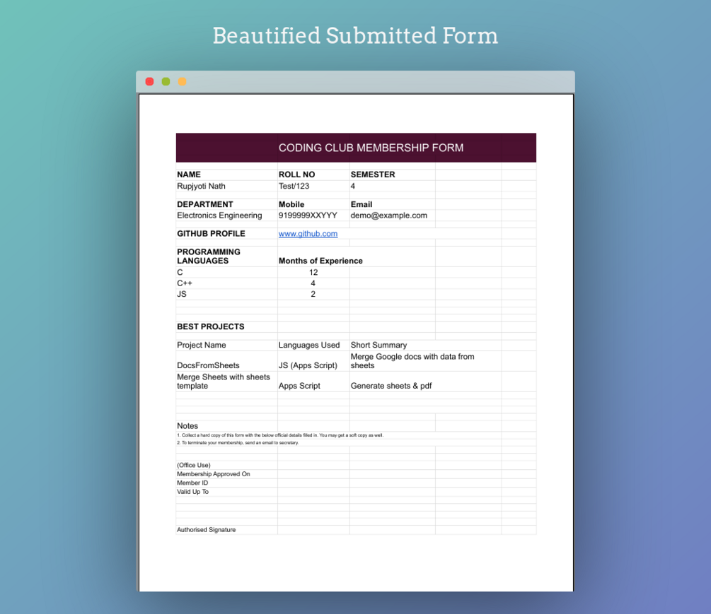 Script (Google Apps Script) to beautify Google Form submissions by merging submission data with a Spreadsheet template to create sheet & PDF.